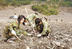新開部落迄今仍有二十五位罹難者被掩埋在三層樓高的土石堆,前天臺軍在韓籍救難隊(duì)員指導(dǎo)下,趴在土石堆上,試圖循著臭味發(fā)現(xiàn)遺體。