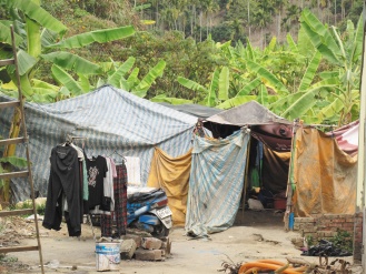 簡陋破落帳篷搭在香蕉園里,卓姓夫妻與兒子擠在不到兩坪的空間里;室內堆放著臟亂衣物等用品,睡覺的地方用木板稍隔開,陳設比起工寮還要簡陋。緊鄰廚房僅有一只燒柴鍋子,卓家女主人鍋子正在蒸蛋,蒸蛋的水暗沉,她說:“這是早餐!