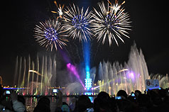 中新網(wǎng)2月21日電 據(jù)“中央社”報(bào)道,2010高雄燈會(huì)藝術(shù)節(jié)20日晚登場,由蕭萬長與高雄市長陳菊共同點(diǎn)燈,海上主燈“高雄;ⅰ贝钆渌、雷射與高空煙火的聲光效果,絢爛奪目,前來觀賞民眾,萬頭攢動(dòng)。