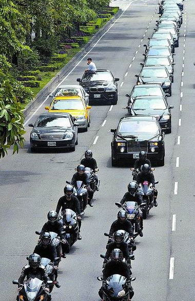 昨迎靈隊(duì)伍由12輛黑色重型摩托車前導(dǎo),36輛勞斯萊斯、奔馳、BMW等名車從喪宅出發(fā),車隊(duì)浩浩蕩蕩綿延逾一公里,引人側(cè)目。