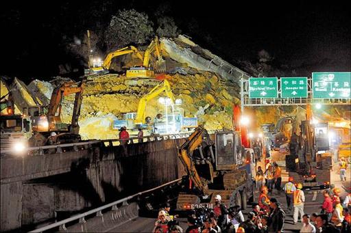 由于土石量太大,總重超過(guò)20萬(wàn)噸,臺(tái)灣“高速公路局長(zhǎng)”曾大仁表示,將全面搶修,希望兩周內(nèi)清理完土石,搶通可能需20日以上;不過(guò)軍方搶救人員昨晚接到軍方高層最新指令,要求一周內(nèi)全力搶通。