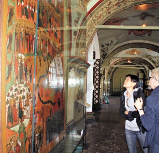 周美青在俄方人員陪同下參觀了修道院,并進入院內(nèi)的一間教堂,她對教堂內(nèi)東正教的圣像畫特別感興趣,其中一幅壁畫“末世的審判”描繪東正教里人與天地的關(guān)系,以及天堂與地獄的對比,周美青在壁畫前駐足良久仔細欣賞,似乎對東正教信仰有所體會。