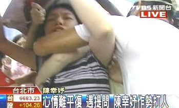 陳幸妤連日來(lái)傳出因?yàn)樵庀拗瞥鼍,無(wú)法赴美進(jìn)修而心情不穩(wěn),見(jiàn)到媒體提問(wèn),對(duì)于陳水扁寫信向馬英九陳情,陳幸妤聽(tīng)完問(wèn)題后,變的激動(dòng)情緒崩潰,更一度沖向記者,作勢(shì)要拍打媒體鏡頭。