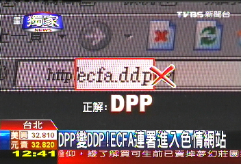 中新網(wǎng)7月2日電 據(jù)臺(tái)灣TVBS報(bào)道,兩岸經(jīng)濟(jì)架構(gòu)協(xié)議(ECFA)在島內(nèi)引起爭(zhēng)議,民進(jìn)黨表達(dá)抗議發(fā)起ECFA“公投”聯(lián)署。只是宣傳ECFA“公投”的網(wǎng)站,現(xiàn)在卻被發(fā)現(xiàn)出現(xiàn)山寨版,網(wǎng)址民進(jìn)黨的英文縮寫(xiě)DPP變成DDP,一點(diǎn)進(jìn)去竟然是露點(diǎn)色情網(wǎng)站,民進(jìn)黨當(dāng)然尷尬。