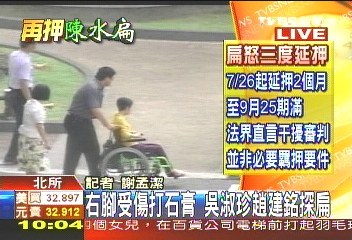 中新網(wǎng)7月16日電 據(jù)臺(tái)灣TVBS報(bào)道,陳水扁因右腳肌腱炎受傷而打上石膏,吳淑珍16日上午帶著女婿趙建銘,前往臺(tái)北看守所探視陳水扁。