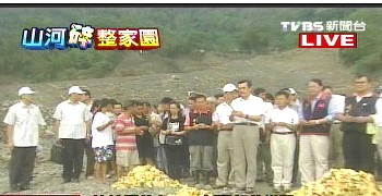 而馬英九到了遭土石掩埋的新開部落,也在當(dāng)?shù)胤傧慵腊萃稣,神情凝重;在進(jìn)入新開部落前,會經(jīng)過日前災(zāi)民立牌寫著“32人死亡,SOS”的新寶橋,因?yàn)闃驍嗔耍┕挝幌仍诤哟蹭伾媳愕,讓車子可以通過。