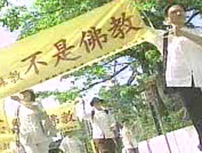 來(lái)自臺(tái)北的“正覺(jué)佛教基金會(huì)”成員在高雄巨蛋外舉著布條和標(biāo)語(yǔ),高喊“(達(dá)賴(lài)?yán)?不是和平者、否定正法、死后必下地獄”等口號(hào)。