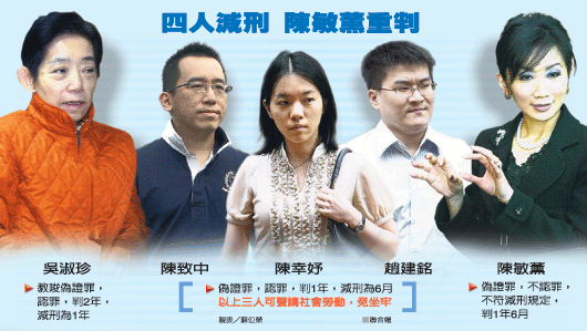 中新網(wǎng)9月2日電 據(jù)臺(tái)灣《聯(lián)合報(bào)》報(bào)道,陳水扁女兒陳幸妤、女婿趙建銘、兒子陳致中因偽證罪被判刑六月,雖不能易科罰金,但可以易服社會(huì)勞動(dòng)。檢方表示,未來(lái)原則上會(huì)核準(zhǔn)趙建銘、陳幸妤聲請(qǐng)義診替代服刑,但法律勞務(wù)暫不需要,因此陳致中可能被安排清潔小區(qū)。