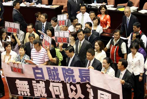 據(jù)臺(tái)灣媒體報(bào)道,吳敦義上午就來(lái)到“立法院”準(zhǔn)備報(bào)告施政方針,但還沒上臺(tái),事前保密到家的民進(jìn)黨“立委”們,突然拿著白布條、標(biāo)語(yǔ)霸占主席臺(tái),大喊“白賊義,道歉”,稱吳敦義香港行的說法一變?cè)僮儯姓\(chéng)信問題。吳敦義則留在原位,國(guó)民黨人上前安撫,也做護(hù)駕動(dòng)作,避免與民進(jìn)黨“立委”發(fā)生肢體沖突。