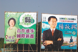 中新網(wǎng)1月18日電 綜合臺灣《聯(lián)合報》報道,大高雄市長選舉,民進(jìn)黨“秋菊之爭”兩人比鄰豎立廣告牌,“合作進(jìn)步,國際新都”與“五顆星南方小巨人”互別苗頭。