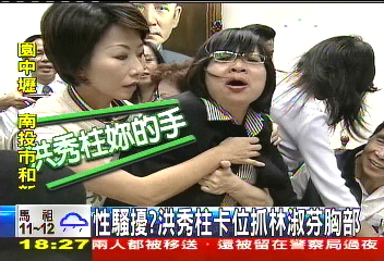 據(jù)臺灣TVBS報道,國民黨“立委”洪秀柱跟民進黨“立委”林淑芬,為了搶發(fā)言臺的位置,洪秀柱從后方抓林淑芬,不偏不倚剛好抓住林淑芬的胸部,后來為了卡位,洪秀柱的頭,又卡在男性“立委”蘇震清的胯下。