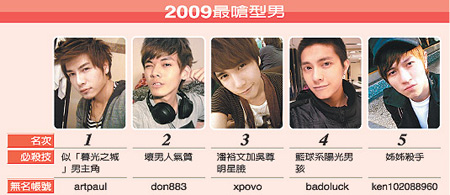 奪得去年年度總冠軍的型男森田是職業(yè)模特兒,曾擔(dān)任“今天你要嫁給我”MV男主角,也拍過電廣告,外型酷似電影“暮光之城”男主角羅伯派丁森。第二名的世新大學(xué)新聞系大三生吳東穎,外型帶點壞男人的味道。他每周會到誠品三、四次,從雜志上得知最新流行信息,參考風(fēng)格。