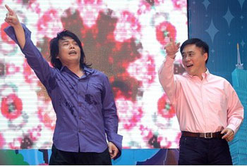 中新網(wǎng)5月19日電 據(jù)“中央社”報(bào)道,臺(tái)北市將舉辦花卉博覽會(huì),藝人伍佰19日身披紙制環(huán)!疤諔(zhàn)警裝”化身“i花博”環(huán)保親善大使,與臺(tái)北市長(zhǎng)郝龍斌大跳招牌花朵舞。伍佰高唱“你是我的花博”,強(qiáng)調(diào)愛(ài)地球、做環(huán)保,要“不眠也不休”。