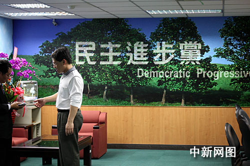 民進(jìn)黨黨部接待大廳,原本掛著一幅大廣告,是2008年7月蔡英文和陳水扁、呂秀蓮、蘇貞昌、謝長(zhǎng)廷、游錫堃等人的牽手合照,不過,這幅人物廣告,最近卻悄悄地撤下了。取而代之的是一幅“幾棵綠樹”組成的廣告牌。引發(fā)外界“去扁”猜想。民進(jìn)黨發(fā)言人蔡其昌則強(qiáng)調(diào)是因?yàn)椤把b潢久了,總是要換新的”。圖為1月20日的民進(jìn)黨黨部接待大廳。中新網(wǎng)發(fā) 陳立宇 攝