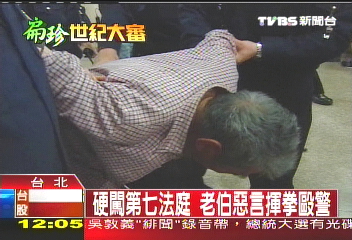 中新網(wǎng)2月26日電 據(jù)臺灣TVBS報道,陳水扁連續(xù)3天開庭,庭外依舊鬧哄哄,今天一名70多歲的老伯,在開庭后硬要闖入第七法庭,鬧場舉動引來法警關(guān)切,沒想到老伯面對人數(shù)眾多的法警,不但口出惡言,還出手打人,法警忍無可忍,最后強制執(zhí)行公權(quán)力趕人。