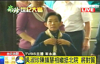 中新網(wǎng)3月17日電 據(jù)臺灣TVBS報(bào)道,17日下午2點(diǎn)24分,陳水扁夫人吳淑珍穿著藍(lán)色針織毛衣,披著絲巾,在兒子陳致中的陪同下,進(jìn)入法院。陳鎮(zhèn)慧則是戴著大墨鏡,白外套、黑上衣,低調(diào)進(jìn)入法院。今天首次進(jìn)入實(shí)質(zhì)審理,雙方對質(zhì),備受注目!