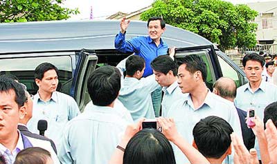 中新網3月23日電 據(jù)臺灣《蘋果日報》報道,馬英九22日下午前往嘉義視察途中,座車左后輪突然爆胎,緊跟在后方的廂型車緊急煞車與座車輕微追撞,由于事發(fā)突然,隨行安全人員嚇了一跳,馬英九了解狀況后,立即換車繼續(xù)行程。馬英九安全未受影響,事后也表示自己“處變不驚”。