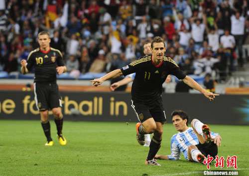 中新網(wǎng)7月3日電 今晚22:00,南非世界杯1/4決賽第三場(chǎng)展開了角逐,阿根廷隊(duì)在開普敦綠點(diǎn)球場(chǎng)迎來(lái)了德國(guó)隊(duì)的挑戰(zhàn)。穆勒在上半場(chǎng)第3分鐘先拔頭籌,下半場(chǎng)克洛澤梅開二度,弗雷德里希也打入一球,德國(guó)隊(duì)4-0狂勝阿根廷,昂首晉級(jí)半決賽。
