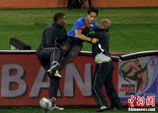主裁判立即吹停了比賽,這位球迷最終也“束手就擒”。盡管他沒有襲擊任何隊(duì)員的意向,也沒有做出其他過激舉動,但他能這么輕松地沖進(jìn)場內(nèi),顯然讓南非世界杯組委會的安保人員大跌面子,而且就在比賽結(jié)束后,又有一名脫掉上衣的男性球迷沖入場內(nèi)。世界杯的安保正被敲響警鐘,尤其是——決賽很快就要到來了!