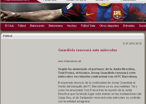 中新網(wǎng)7月14日電 北京時(shí)間今日,西班牙巴塞羅那俱樂部在其官網(wǎng)官方宣布,主帥瓜迪奧拉將于當(dāng)?shù)貢r(shí)間星期三與球隊(duì)續(xù)約。據(jù)西媒體報(bào)道,瓜迪奧拉新合約將為期三年。