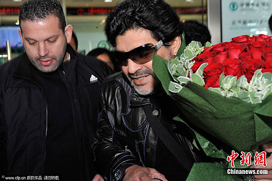 上午8時58分。原定9點半抵達的德國漢莎航空公司航班抵達首都國際機場三號航站樓,約一個小時后,馬拉多納終于出現(xiàn)在眾人的視線內(nèi)。在國際到達出口,身著黑夾克、戴著墨鏡的馬拉多納顯得精神矍鑠。他熱情地和現(xiàn)場的歡迎者打招呼,隨后球王手捧鮮花,登上了機場的擺渡車。