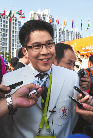 升旗儀式結(jié)束后,霍啟剛便和香港代表團(tuán)的運(yùn)動員們簇?fù)碓谝黄鸷嫌傲裟,作為代表團(tuán)副團(tuán)長的他,自然沒有忘記自己的身份!斑@一次你會去看跳水嗎?”當(dāng)華西都市報記者將這個問題拋給霍啟剛時,他笑了一笑:“我就知道你要問我這個問題,在香港我就一直被問這個問題,到這里來還是被問這個問題,哈哈!被魡偟钠胀ㄔ挿浅(biāo)準(zhǔn),周圍的香港媒體聽到了霍啟剛這樣回答,也都笑了起來。