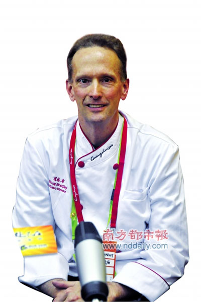這名身高1 .95米的美國(guó)“總廚”,自2008年北京奧運(yùn)會(huì)后便定居中國(guó),去年12月份還把家安在了廣州,喜歡吃燒鵝,也習(xí)慣在飯后喝上一碗雙皮奶當(dāng)甜品。“但是 ,中國(guó)菜能進(jìn)亞運(yùn)菜單絕不是我一個(gè)人說(shuō)了算”。