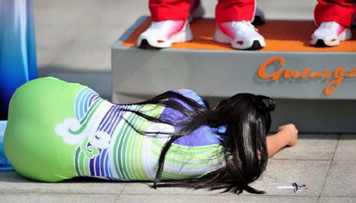 就在“暈倒姐”事件發(fā)生的前兩天,在亞運(yùn)會(huì)射擊比賽的頒獎(jiǎng)儀式上,一名叫蘇婉君的禮儀小姐也是托著裝滿獎(jiǎng)牌的盤子,累得發(fā)抖,幸被獲得冠軍的外國選手幫忙。據(jù)蘇婉君介紹,那個(gè)擺放了鮮花或獎(jiǎng)牌的托盤很沉,即使什么東西也不放,分量也是非常重的。