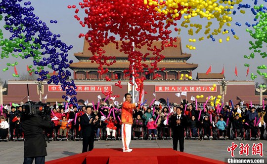 中新網(wǎng)北京12月4日電 2010年廣州亞洲殘疾人運動會火炬點燃暨火炬?zhèn)鬟f活動啟動儀式,今日上午在北京人民大會堂北大廳舉行。中共中央政治局常委、國家副主席習(xí)近平在啟動儀式上點燃主火炬,并宣布火炬?zhèn)鬟f活動開始。