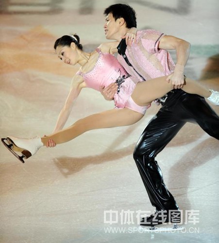 2009年2月25日,為答謝觀眾,獲得第24屆世界大學(xué)生冬季運動會花樣滑比賽前三名的選手,在哈爾濱國際會展中心體育館進(jìn)行表演。圖為獲得雙人滑冠軍的中國選手張丹/張昊激情演出。(中體在線圖片 白宇 攝)