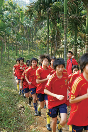 再往里走,便看見了一群十五六歲的女孩。她們穿著統(tǒng)一的紅色運(yùn)動(dòng)衣,在坑洼不平的操場(chǎng)上奔跑著,身旁跟隨著她們的教練肖山,剛才那個(gè)沙啞的聲音就是他喊的!敖裉煊(xùn)練表現(xiàn)最好的隊(duì)員,一會(huì)兒才有雞腿吃!”肖教練說。