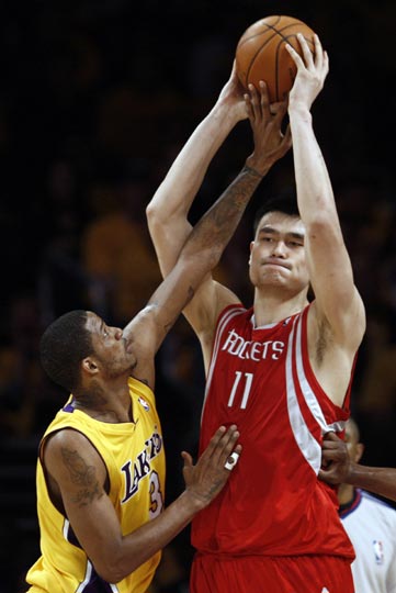 中新網(wǎng)5月5日電 北京時(shí)間今日,NBA西部半決賽第二場(chǎng)比賽繼續(xù)進(jìn)行,由休斯敦火箭隊(duì)客場(chǎng)挑戰(zhàn)湖人。姚明打出了堪稱是自己職業(yè)生涯最偉大的一場(chǎng)比賽:他在第四節(jié)遭科比撞傷膝蓋,但毅然拒絕了隊(duì)醫(yī)回更衣室接受治療的提議,仍舊堅(jiān)持上場(chǎng)。最終姚明砍下28分10個(gè)籃板2次封蓋1次搶斷,火箭也得以在客場(chǎng)搶下一場(chǎng)寶貴的勝利。