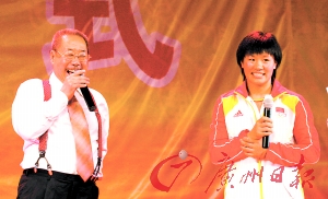 楊秀麗從沒有覺得如此緊張過,即便是去年北京奧運會78公斤級柔道比賽中,在自己奪得金牌的過程中也沒有像現(xiàn)在這樣緊張得口干舌燥。旁邊站著的可就是都本基大師,一個為北京奧運會開幕式引導(dǎo)牌題字并被張藝謀所推崇的大師,一個為泰山碧霞祠題寫大殿對聯(lián)的大家!艾F(xiàn)在有個新環(huán)節(jié),奧運柔道冠軍楊秀麗希望能拜都本基大師為師學(xué)習書法!毖胍暶齑抻涝倪@句話聽得楊秀麗心驚肉跳!拔以敢馐账秊橥剑 倍急净舷壬实卮饝(yīng)。