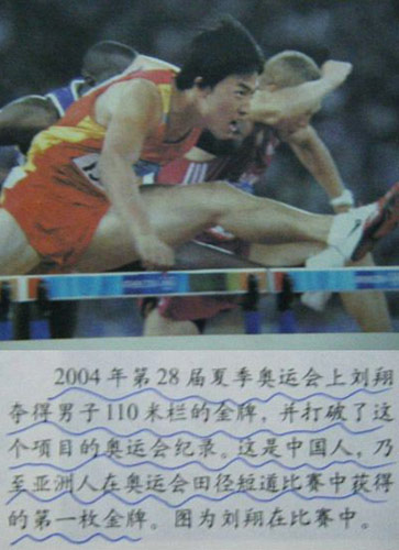 在圖片下附著的文字說明這般寫道:“2004年第28屆夏季奧運(yùn)會上劉翔奪得男子110欄的金牌,并打破了這個項目的奧運(yùn)會紀(jì)錄。這是中國人乃至亞洲人在奧運(yùn)會田徑短道比賽中獲得的第一枚金牌。圖為劉翔在比賽中!