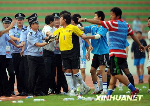 14號(hào)劉青在休息室門(mén)口看到此景,試圖掙脫警察的阻擋沖上前去。就在天津隊(duì)員追打裁判時(shí),一名球員將裁判的電子記錄牌扔在地上狂踩。這時(shí),警察趕到將天津隊(duì)員強(qiáng)行分離,并送至球場(chǎng)內(nèi)?磁_(tái)上的山東觀眾發(fā)出噓聲,并將水瓶扔向天津隊(duì)員。一名天津隊(duì)員向看臺(tái)伸出了中指,已坐在球場(chǎng)中間的李根聽(tīng)到球迷的罵聲后再次沖出人群試圖爬上看臺(tái),被警察制止。