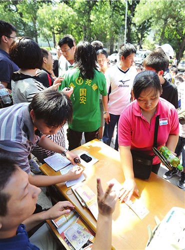據(jù)球迷王先生介紹,他想要購買的是本月30日國安對陣魯能的比賽門票!瓣P(guān)系到國安今年能否在中超奪冠,作為十幾年的國安球迷,這場比賽我們必須去見證!睘橘I到門票,王先生昨天早上5點(diǎn)就到工體北門守候。當(dāng)時排在他前面的人只有5個,按照當(dāng)天該售票點(diǎn)發(fā)售500張票、每位球迷限買兩張票的情況,他覺得無論如何都能買上票。