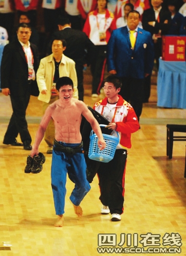 同樣,在比賽中受傷的山西隊楊波在男子60公斤級比賽中迎戰(zhàn)解放軍隊阿拉木斯時,在比賽后借勢坐在場地上拒絕離開,并怒砸場地。而女子48公斤級決賽中,四川隊選手龔華也站在場地拒絕離場,在裁判交涉后才離開場地。