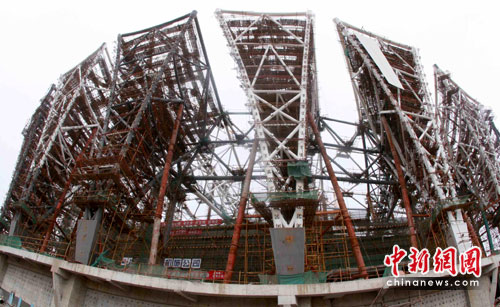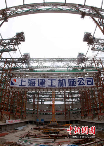 中新網上海3月30日電 (鄭瑩瑩 黃晨光)30日,上海建工機施公司建設者將最后一榀重65噸的鋼桁架起吊至上海東方體育中心的綜合館40米高的預定位置,標志著該工程主體鋼結構安裝全部完成。