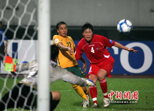 女足亞洲杯決賽在澳大利亞與朝鮮隊之間展開,上半場第18分鐘,澳大利亞隊22號前鋒薩曼莎?科爾單騎殺入朝鮮隊禁區(qū),在無人防守的情況下抽射,球打到遠端門柱彈入網(wǎng)內(nèi)。澳大利亞1:0領(lǐng)先。