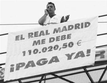 為了從皇馬俱樂部手中拿到這筆工程款,馬修鋁業(yè)公司老板卡洛斯·馬特奧不得不登上起重機(jī)上到高空,并貼出討債大字報,他希望通過這種方式引起全西班牙的關(guān)注,并逼迫皇馬盡早支付這筆款項。