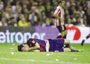 不過最讓巴薩不爽的還不是無奈將榜首席位讓給死敵皇馬,而是該隊頭牌梅西在比賽中兩度受傷。先是在第20分鐘,梅西在爭搶時,被對方身高1米92的中衛(wèi)埃莫雷維埃抬腳亮出的鞋釘狠狠踩中右臉部,顯然埃莫雷維埃抬腳過高就是故意沖著梅西去的。梅西當(dāng)即痛苦地捂臉倒地,隊醫(yī)立即進場緊急處理,好一會梅西才起身,但靠近右眼的部分已經(jīng)被鞋釘劃出了一道很深的血口。但梅西還是堅持比賽,因此盡管梅西此戰(zhàn)沒能進球幫助巴薩取勝,但賽后梅西帶傷作戰(zhàn)的精神卻贏得了媒體的一致贊揚。但在第76分鐘,梅西因肌肉拉傷還是提前被博揚換下。據(jù)悉,梅西賽后檢查的結(jié)果是傷勢很重,極可能將缺席本周在歐冠、西甲中與國米、皇馬的兩場關(guān)鍵戰(zhàn)役。