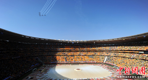中新網(wǎng)6月11日電 隨著羅伯特凱利演唱起本屆世界杯主題曲《勝利的召喚》,南非世界杯開幕式正式落下了帷幕。一個(gè)多小時(shí)之后的22:00,本屆世界杯的揭幕戰(zhàn)就將在這個(gè)體育場打響,東道主南非隊(duì)將迎來小組賽的首個(gè)對手、中北美勁旅墨西哥。