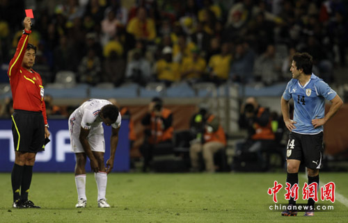 第79分鐘,馬盧達(dá)橫向帶球之后一腳遠(yuǎn)射,偏的不多頗具威脅。第81分鐘,場上風(fēng)云突變。替補(bǔ)登場的洛德伊羅放倒并踩踏薩尼亞,吃到第二張黃牌之后被紅牌罰下,這也是本屆世界杯的第一張紅牌。值得一提的是,烏拉圭隊(duì)是世界杯預(yù)選賽中吃黃牌最多的球隊(duì),共吃到55張,而本場比賽余下的時(shí)間他們只能以10人應(yīng)戰(zhàn)。