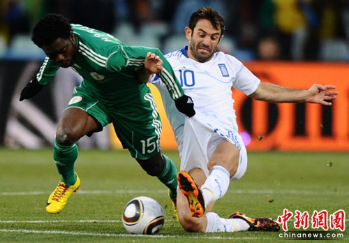 中新網(wǎng)6月17日電 北京時(shí)間今晚22時(shí),南非世界杯B組第二輪比賽打響,由歐洲勁旅希臘在布隆方丹的自由洲球場迎戰(zhàn)非洲雄鷹尼日利亞。上班時(shí)尼日利亞任意球率先破門,但此后被紅牌罰下一人,希臘隊(duì)隨即抓住機(jī)會(huì),在上下半場各入一球,以2-1逆轉(zhuǎn)擊敗尼日利亞隊(duì)。