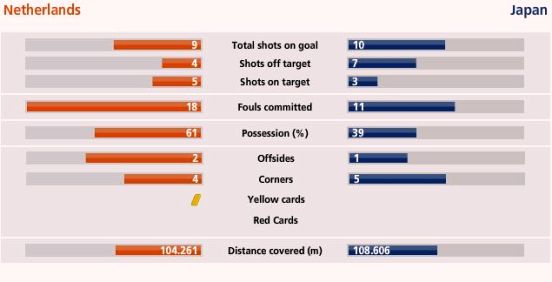 荷蘭隊全場比賽有9腳射門,5次射中門框范圍內(nèi),其中包括一個進球和兩次被日本隊門將川島永嗣化解的必進球機會。日本隊有10腳射門,3腳射中門框范圍,其中最后階段的一次射門險些將比分追平。日本隊的角球同樣多于荷蘭隊,5次角球,比荷蘭隊多了一個。