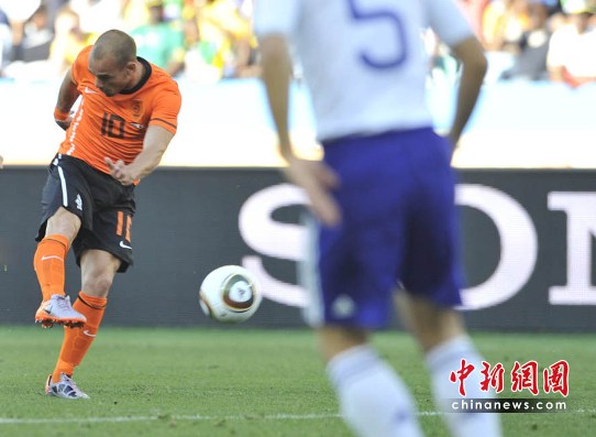 在經(jīng)歷了多半場比賽的僵持后,第53分鐘,“橙衣軍團(tuán)”終于撕開對手防線,范佩西回做,斯內(nèi)德禁區(qū)外沒有停球直接大力遠(yuǎn)射,日本門將川島永嗣奮力撲救,足球碰到他的左臂彈進(jìn)網(wǎng)窩,1比0,荷蘭隊取得勝利。