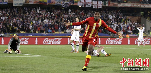 中新網(wǎng)6月27日電 今天凌晨2:30,南非世界杯1/8決賽第二場美國與加納的比賽,在勒斯滕堡的皇家巴福肯球場拉開戰(zhàn)幕。憑借普林斯·博阿滕和多諾萬在上下半場的進球,雙方在90分鐘之內(nèi)戰(zhàn)成1-1平。而加時賽中,中鋒吉安突破射門建功,幫助加納隊昂首晉級八強。
