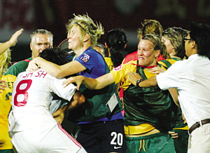 比賽結(jié)束后,按照慣例,雙方球員需要在中圈相互握手?墒且晃话拇罄麃喰(gè)子球員卻趁機(jī)沖到張?jiān)矫媲,一記“老拳”砸向了她的肋骨。后者被打中后立刻倒地不起,并且因(yàn)樘弁措y忍而流淚。這也成為此后騷亂的導(dǎo)火索,看到隊(duì)友被打,中國(guó)隊(duì)的場(chǎng)上球員和場(chǎng)下球員都沖向了這名小個(gè)子球員欲討說(shuō)法,而中方教練也沖到了場(chǎng)內(nèi)。此時(shí)澳大利亞隊(duì)的球員和教練也沖向場(chǎng)內(nèi),一時(shí)間場(chǎng)面十分混亂。雙方不僅互相推搡,更有許多肢體上的接觸。亞足聯(lián)官員看到這一情形后,也快速走向場(chǎng)內(nèi)。經(jīng)過(guò)了長(zhǎng)達(dá)十分鐘的調(diào)解,事態(tài)才逐漸平息。