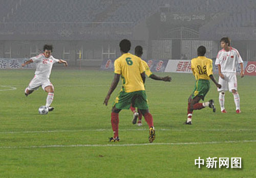 第4分鐘,津巴布韋隊禁區(qū)前犯規(guī),中國國奧獲得禁區(qū)前任意球。20號蔣哲主罰,任意球被對方后衛(wèi)頭球烏龍自家球門,對方門將毫無反應(yīng),只能目送皮球入網(wǎng)。上半場比賽,津巴布韋還沒有像樣的進攻,跑動也比較松散,而中國隊則精神面貌渙然一新,跑動非常積極。第40分鐘,中國隊從左路發(fā)起的,傳中后中路的高迪頭槌中橫梁彈出。王云龍在大禁區(qū)線上得球,盤帶了兩下后打出一腳低射,皮球直掛遠角入網(wǎng)。上半場中國隊以2比0領(lǐng)先。