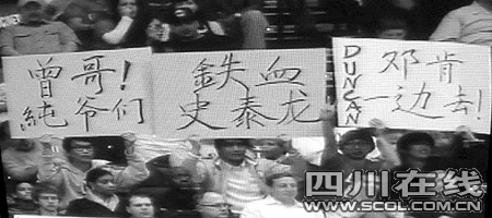 日前,火箭隊(duì)主場(chǎng)迎戰(zhàn)馬刺。雖然火箭以84:92脆敗,但現(xiàn)場(chǎng)球迷打出的標(biāo)語卻著實(shí)雷倒了不少人。據(jù)電視轉(zhuǎn)播的鏡頭顯示,現(xiàn)場(chǎng)有華裔球迷打出“曾哥純爺們”、“鐵血史泰龍”和“鄧肯一邊去”三條中文標(biāo)語,看來“NBA全球化”的步伐還真是影響不小,只不過鄧肯或許會(huì)納悶:這曾哥是誰?竟然比我還厲害。